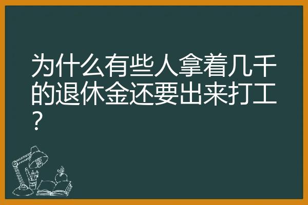 楼主你好,为什么有人拿着几千元的养老金,还要出来打工呢?其实这个问题是多方面的原因,首先,比较常见的原因是经济问题,和自己无法去适应退休生活的问题,这两个原因是比较常见的。我们所说的经济原因就是,在退休以后所能够领取到养老金的待遇,是要远低于自己在岗期间工资性的待遇。那么他只能够退休以后继续工作继续打工,以此来弥补自己退休金的不足。