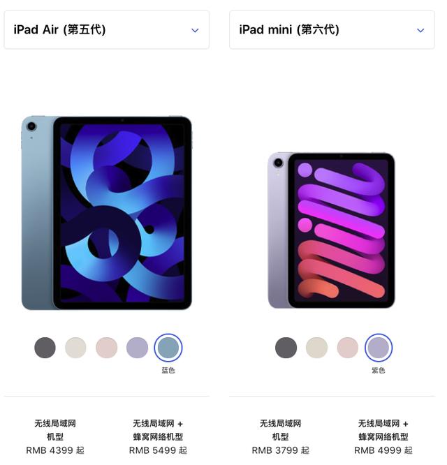 不信我们看官方定价:iPad Air5的WiFi机型分别是4399(64G)和5499(256G),而mini6则是3799(64G)和4999(256G),Air5比mini6分别高了600和500元。