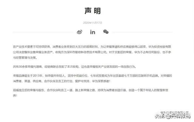 2020年11月17号,在众多媒体发布了相关消息之后,华为终于推出了声明,这则声明非常清晰的解释了,为什么荣耀会被出售?在产业技术要素不可持续获得消费者业务受到巨大压力的艰难时刻,为了让荣耀能够继续的发展,所以决定出售荣耀业务。