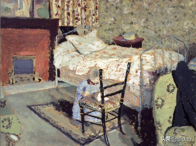 同时,艺术家又用丰富的马赛克,处理画作的细节,他使用中性色彩的朴素区域和苍白的光相互作用于一个亲密的场景,营造出一种温馨神秘的气氛,如通过百叶窗产生的图案为窗下弯身静静缝纫的人物提供了一种生动的感觉。总体而言,维亚尔的油画画风富于美感、高度图案化、装饰性。