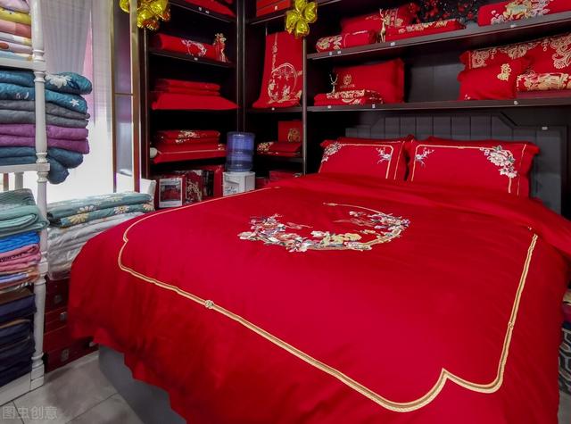 但是不管要买套,必须有一套中国红的,结婚当天必须铺的。上面的图案有的绣着龙凤呈祥,有的绣着百子图。