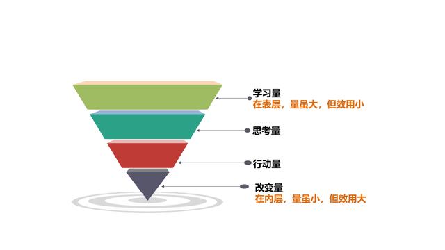人对于一本书的吸收消化就像这个倒三角模型,它分为4层,最表面这一层就是知识摄入量,可以是通过读书,也可以通过上课,还可以是别的方式,这里以读书为例。
