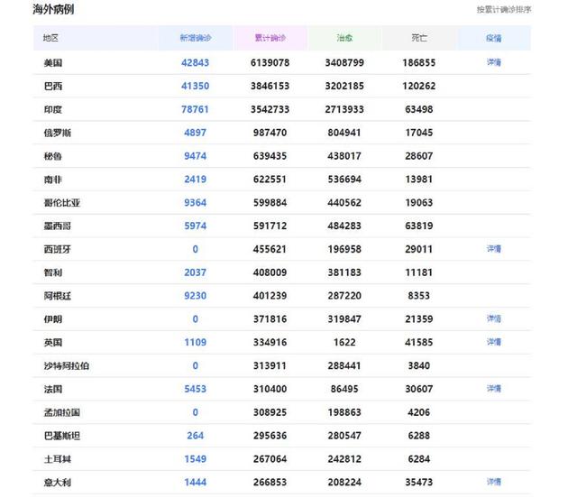 截止到8月29号,美国新冠肺炎新增确诊人数为42843、累计确诊人数为6139078、死亡人数为186855。
