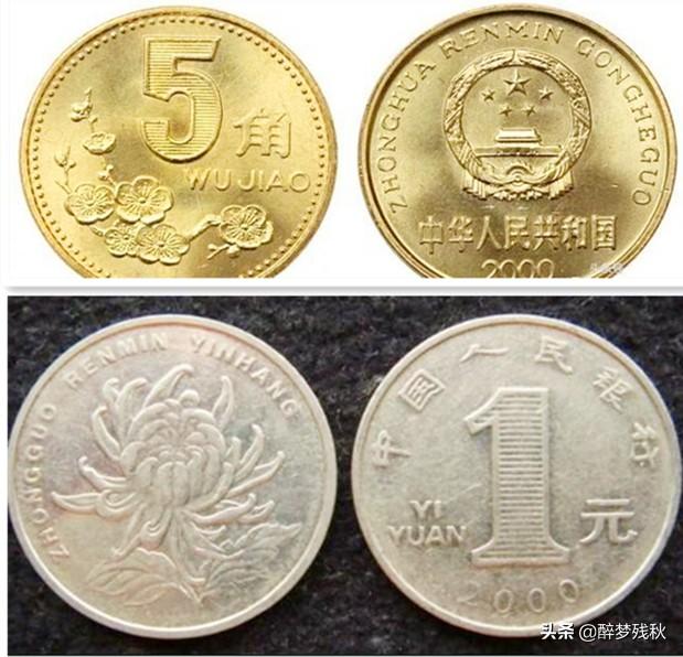 ▲2000年年号的梅花五角和菊花一元普制流通硬币▲