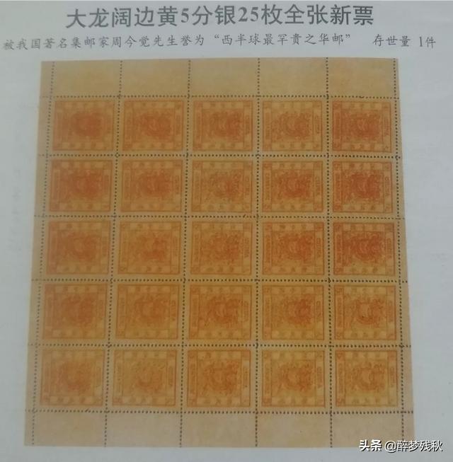 像‘绿衣红娘’、‘宫门倒印’等邮票在不少关于收藏的电视剧里都出现过。而更为珍贵罕见的大龙阔边黄五分银25枚全张新票和红印花小字当一元四方连票以及‘稿’字四方连票等,就是许多老集邮人也难得一见的。