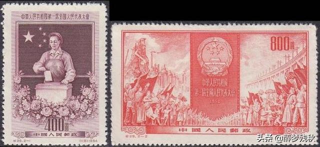 这枚邮票品相保存的不错。这是1954年12月30日发行的《中华人民共和国第一届全国人民代表大会》纪念邮票,志号为‘纪29’,一套两枚,面值分别为旧币(人民币第一套流通纸币)400元和800元,全套面值旧币1200元。全张为竖版80枚(10×8),横版50枚(5×10),由北京人民印刷厂营业分厂印制。