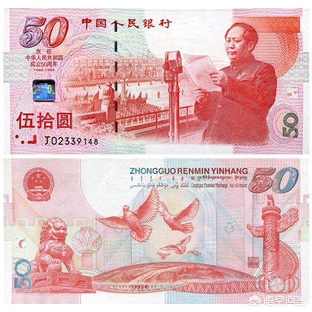 建国五十周年纪念钞(建国钞),1999年发行,发行量6000万张(包括三连体5万套),面值50元,目前市场卖价在500元左右,收价在200元左右。是新中国第一款纪念钞。