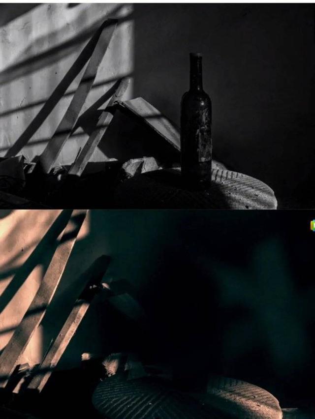与王先生上传的素材相比,《扫黑风暴》这8秒的片头画面颜色不同,但是两者背景的布置,包括桌椅、旧木、石头等几乎一样。另外,两者画面的光影也几乎相同。