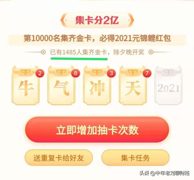 想必大家都和我一样,“牛、气、冲、天”都有了,而且可能还不止一张,但是“2021”显然是“王牌”,目前还没有大量投放出来,数量真的很少。但目前已经显示1485人已经把“牛、气、冲、天、2021”这5张卡集齐了,这就说明“2021”这张卡最少已经发出了1485张。