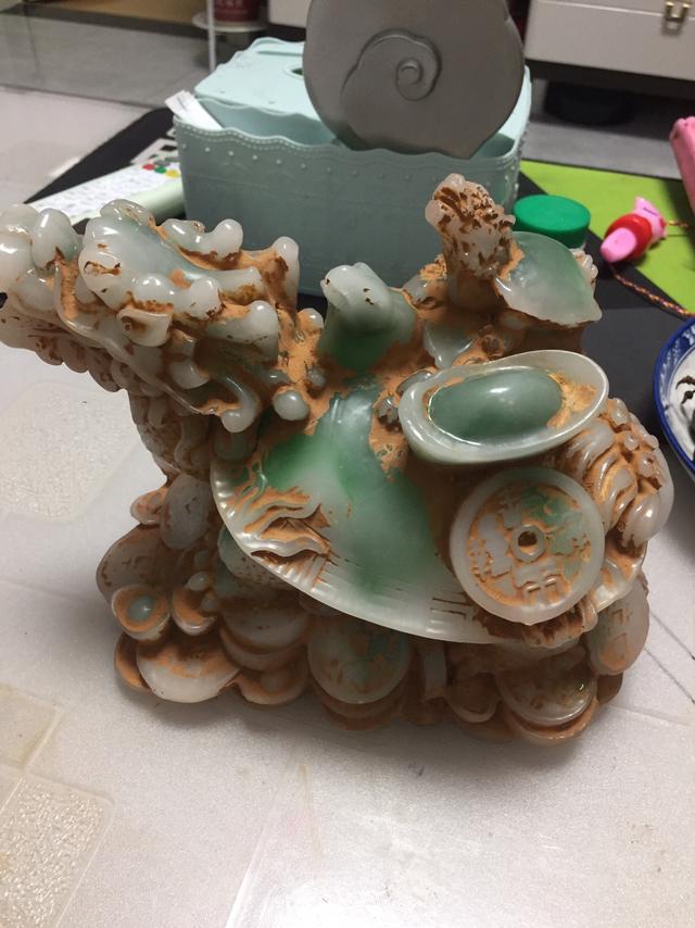 这就是一个树脂合成工艺艺品,该物件通过颜色调合着色,做成仿玉产品,再加上特别作旧,给人们的视觉好像年代很久,其实,不然,说好听的就是个工艺品。