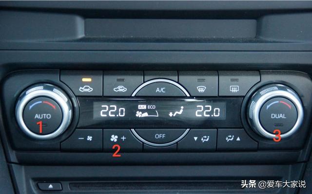 可以看到面板上有两个温度旋钮1和3,这是典型的双区空调,1旋钮控制驾驶员那一侧的温度,3旋钮控制副驾驶那一侧的温度。也就是说主驾驶和副驾驶可以独立选择自己这一侧的空调出风口吹冷风还是热风。同时在旋钮3上还有一个指示灯,上面有英文DUAL,这是调节独立控制还是分区控制的。如果你把3旋钮中间按一下这个指示灯就会亮,此时调节任何一个旋钮都会同时改变正副驾驶的温度,也就是说不存在分区的功能了。