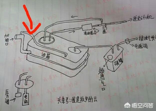 上图是我自己画的油路原理图,各个车型不太一样,但是原理差不多。红色箭头所指的是压力平衡管,加油时汽油从加油口快速进入油箱,这时候油箱内气体会被挤压出去,如果气体从加油口出的话会阻碍汽油流入,容易跳枪,所以油箱都设计有压力平衡管,加油时油箱内气体从油箱上部的压力平衡管流到加油口,被加油枪的油气回收系统收集。如果它破损了当加的太满超过油箱上限时汽油就会从这里泄露。