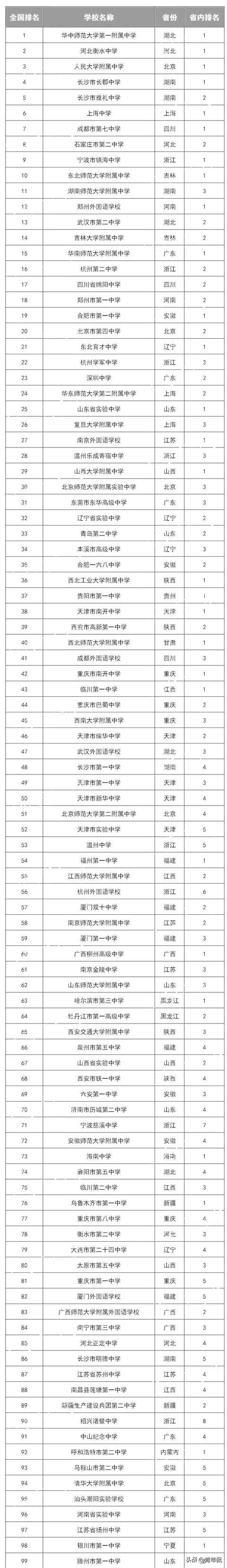 在这种强烈的竞争下当然会有很多高中脱颖而出,无论是在培养尖子生和升学率方面都很厉害。下面我来说安徽省一些比较有名的学校。先来看一张2020年的全国百强中学排名表: